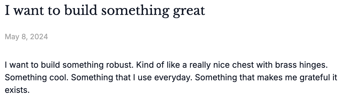 "I want to make awesome physical products. I really like Craighill if you've seen them. Like that but for special stuff I'd use. The only blog post I've ever written is about that."