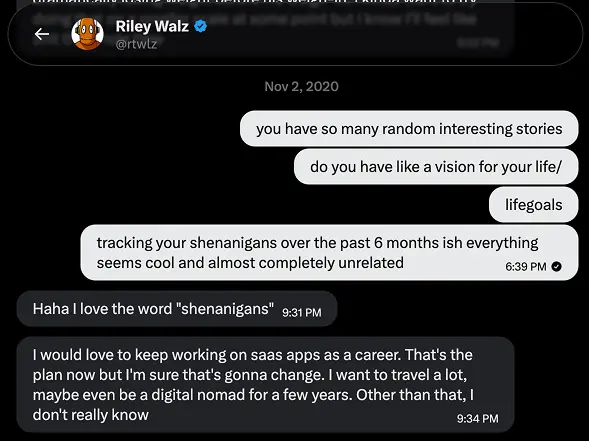 Riley's not much of a job-haver at heart though. He's a guy that has 50+ ideas on his wall in backlog at any given point, so even when he's working, there's always some stuff happening on the side. It was inevitable he'd end up doing his own thing professionally at some point, and in 2023, he moved from NYC to San Francisco with his best friend to start an AI for spreadsheets company. With just two people, they made a product that generated over a million dollars per year. After that year of hard work, they decided to stop working towards growing the startup and used the proceeds to just cover their living expenses while they focused on other things.